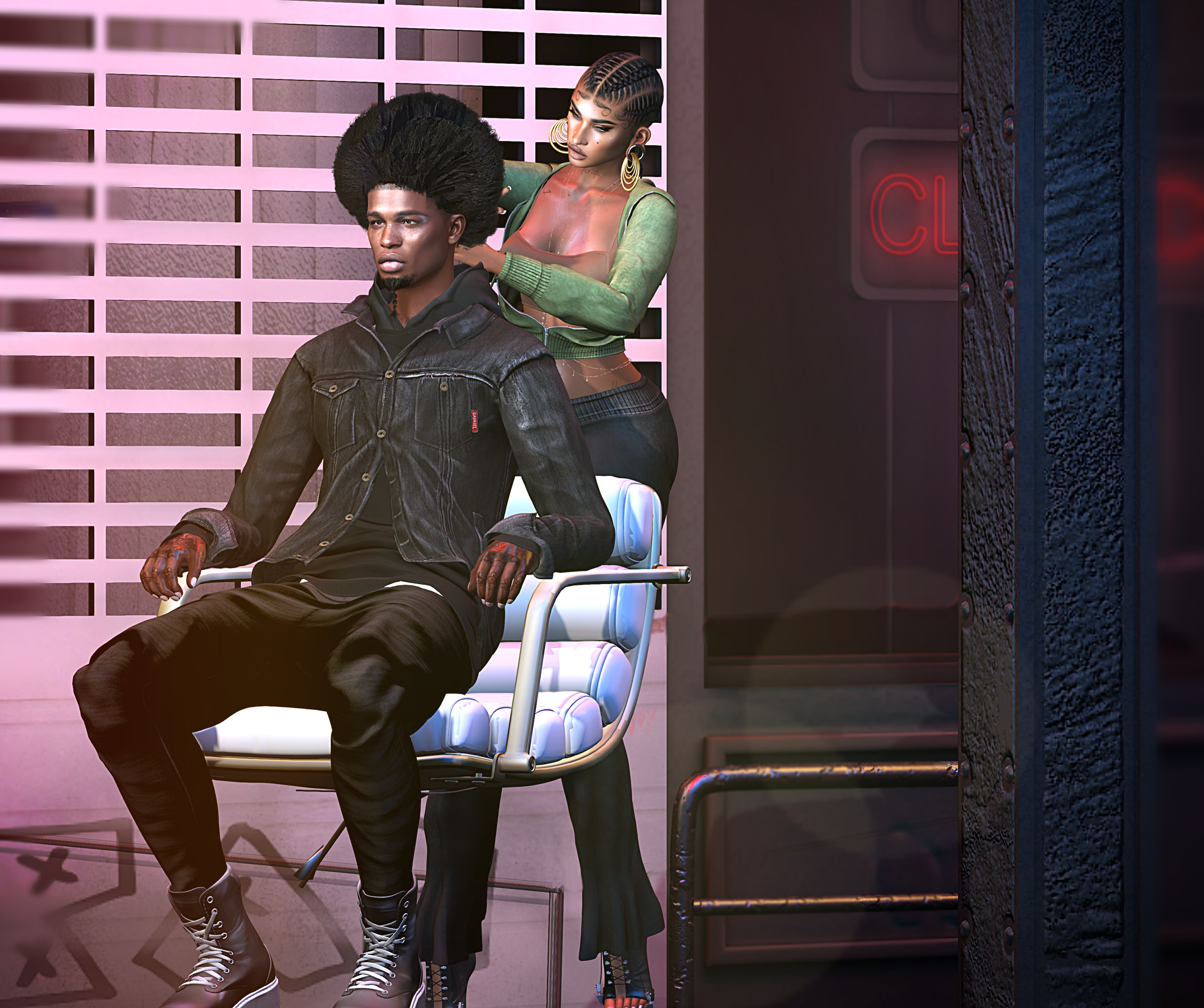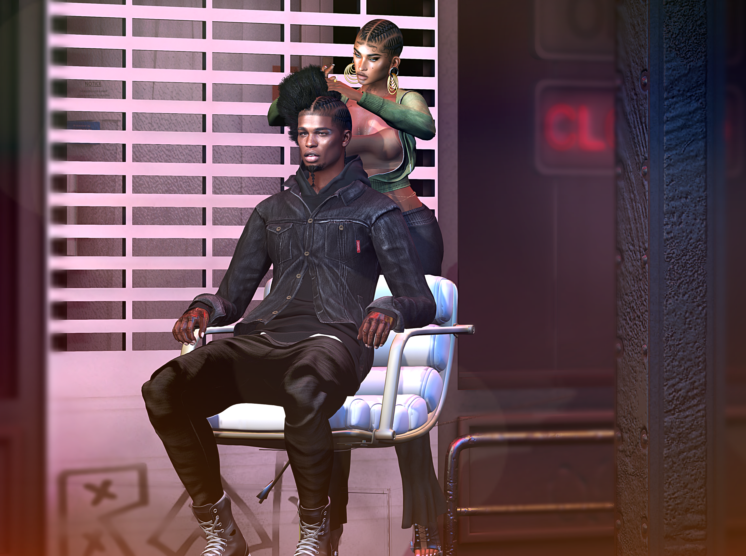 New! Unorthodox in SL and in collaboration with HIGH V., “Bars” interactive mesh hair includes male & female versions of the hair, built-in resizer, BOM hairbase & baby hairs, Scalpz 2.0 applier hud, comb. The “Bars” mesh chair by High V is required for the hair to go from afro to braids. Two-person, two different types of animations; Type 1 goes through the entire animations movie style, while Type 2 is a step-by-step.